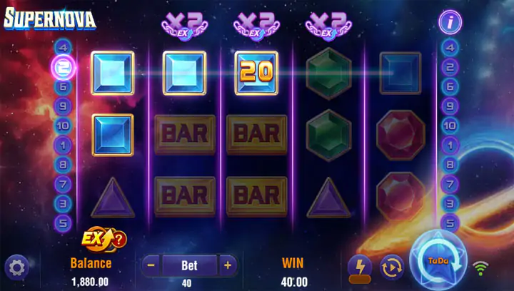 - สัญลักษณ์ Wild: “Supernova Core” (แกนซูเปอร์โนวา) สีทอง สามารถแทนได้ทุกสัญลักษณ์ยกเว้น Scatter