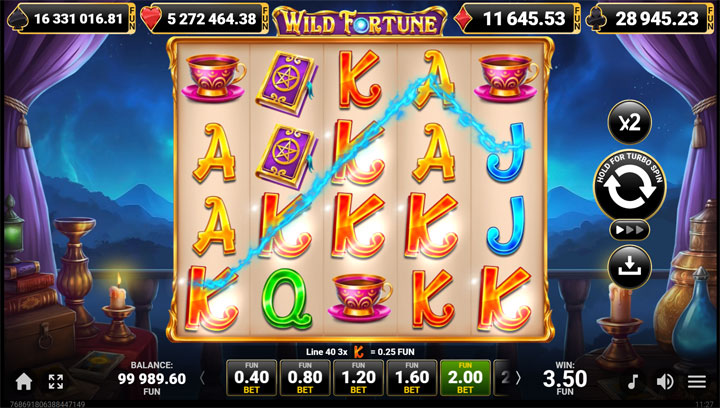 Wild Fortune เป็นเกมวิดีโอสล็อตแบบ 5 รีล 4 แถว พร้อมด้วย 40 เพย์ไลน์คงที่ ซึ่งหมายความว่าผู้เล่นสามารถเดิมพันได้ในทุกไลน์โดยไม่ต้องปรับแต่งมากนัก ธีมของเกมได้รับแรงบันดาลใจจากโลกแห่งเวทมนตร์และการทำนายดวงชะตา โดยมีตัวละครหลักคือหมอดูสาวสวยที่สวมผ้าโพกหัวสีแดงและเครื่องประดับลึกลับ เธอจะปรากฏตัวในรูปแบบของสัญลักษณ์ Wild ที่สามารถขยายตัวครอบคลุมทั้งรีลได้